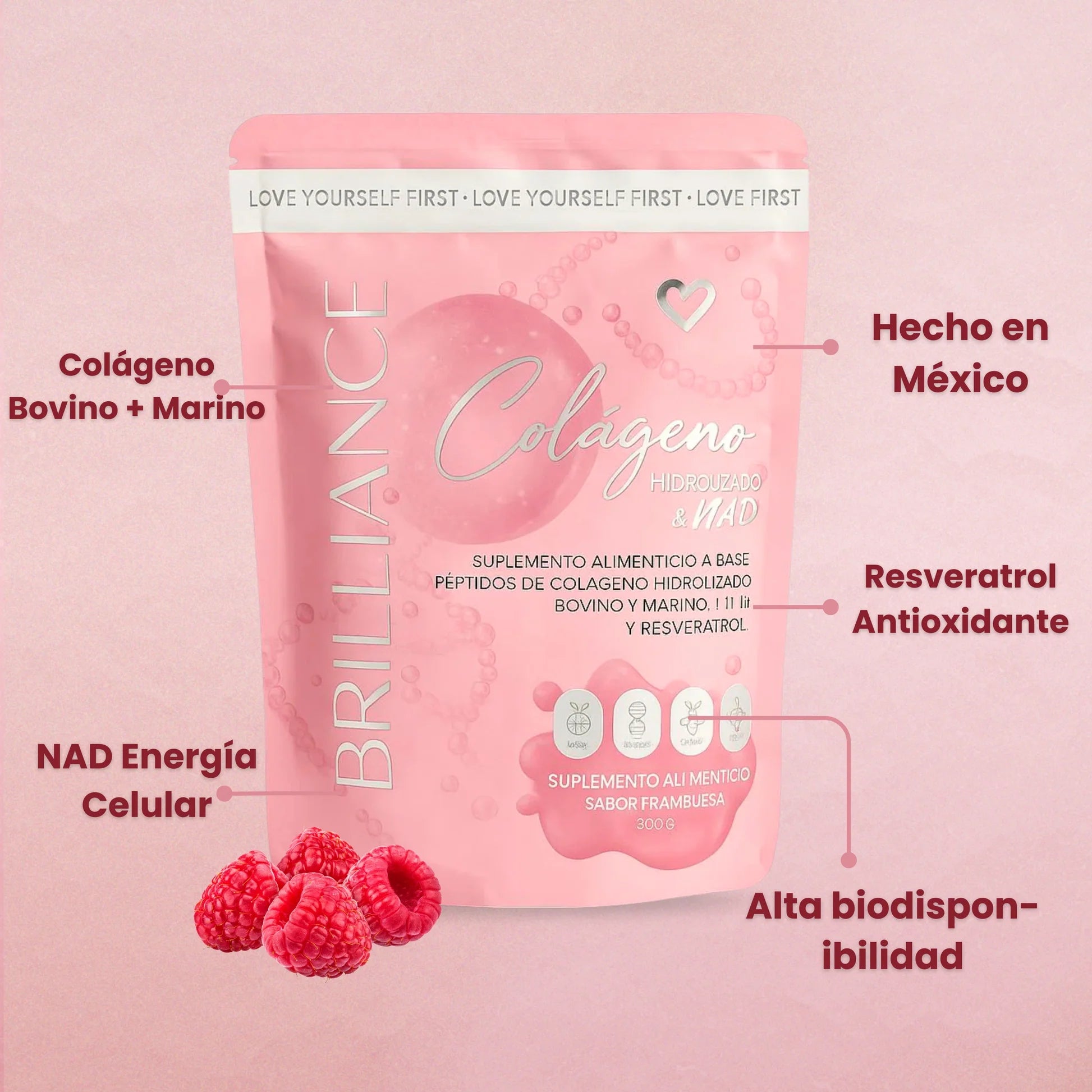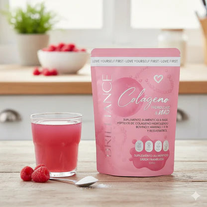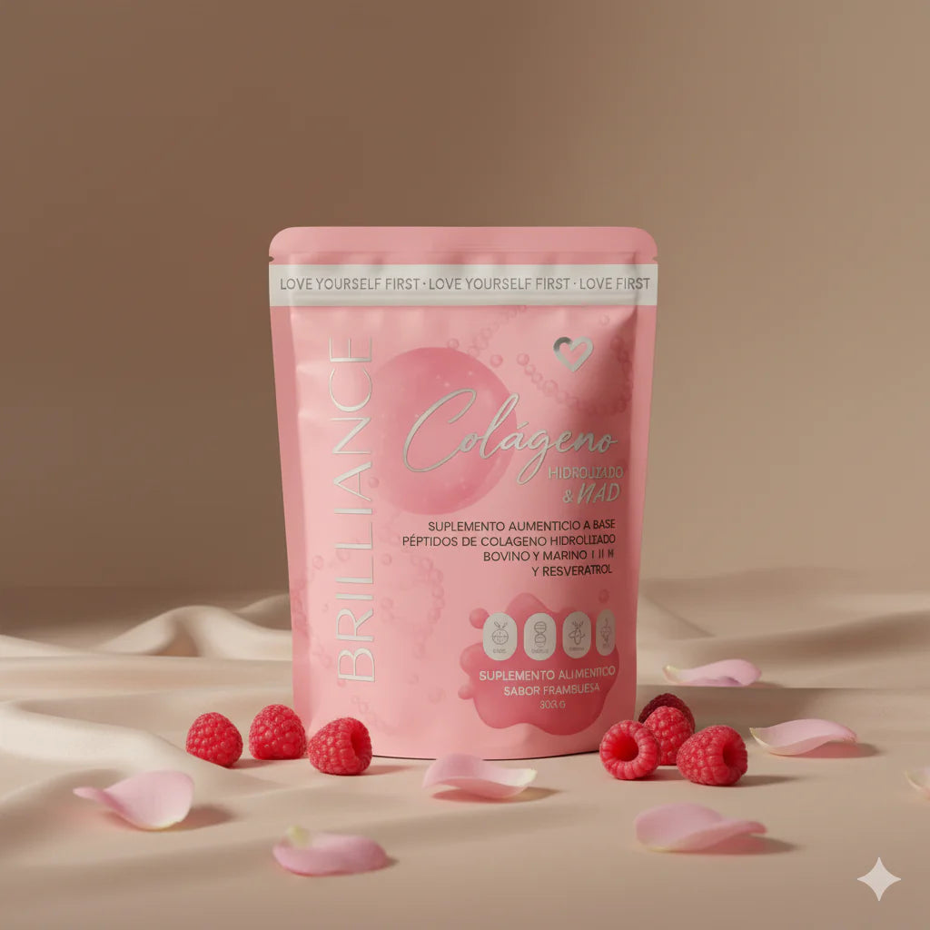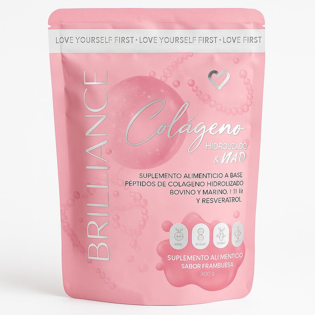 No es solo colágeno… es tu nuevo ritual de amor propio. Brilliance es un suplemento alimenticio con sabor frambuesa que combina péptidos de colágeno bovino y marino tipo I, II y III con super ingredientes como biotina, ácido hialurónico, resveratrol y vitaminas esenciales que tu cuerpo ama. Todo en una fórmula deliciosa que se disuelve fácilmente en agua o tu bebida favorita.